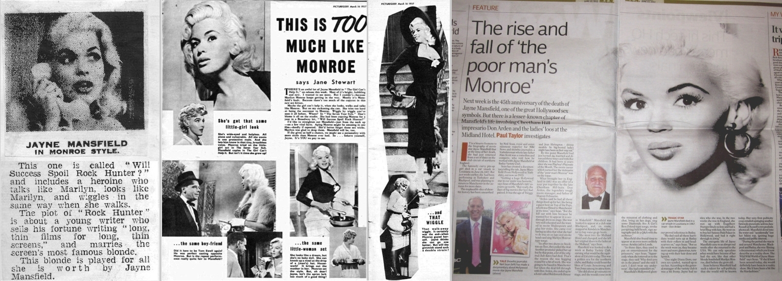 Monroe's photo is beneath headlines concerning "Flying Saucers" and "Jayne