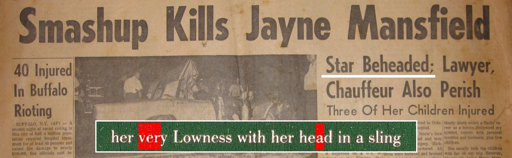 "The top of the car was sheared off, leaving Jayne Mansfield decapitated."
