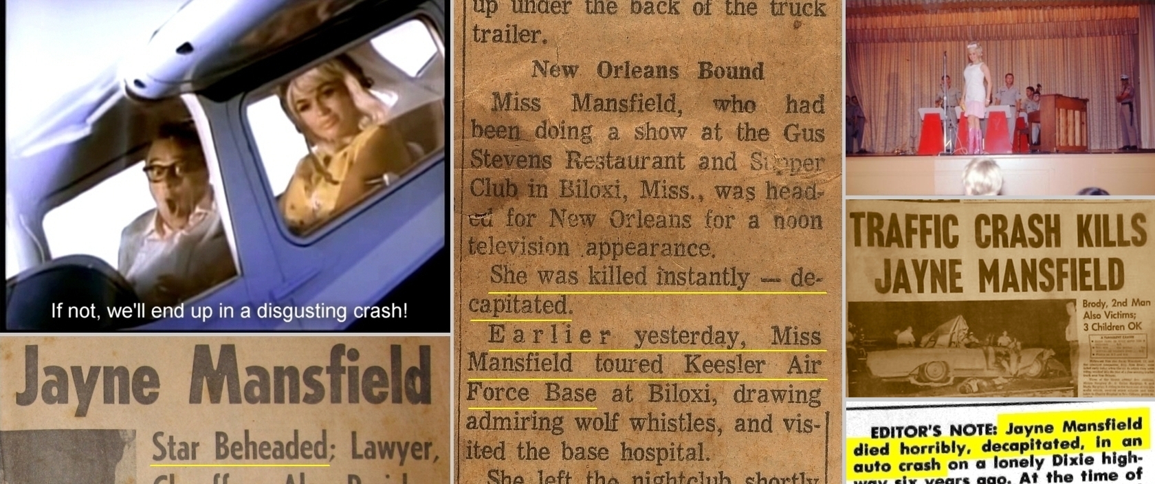 actress Jayne Mansfield recites the line that foreshadowed her actual death. ...